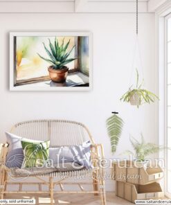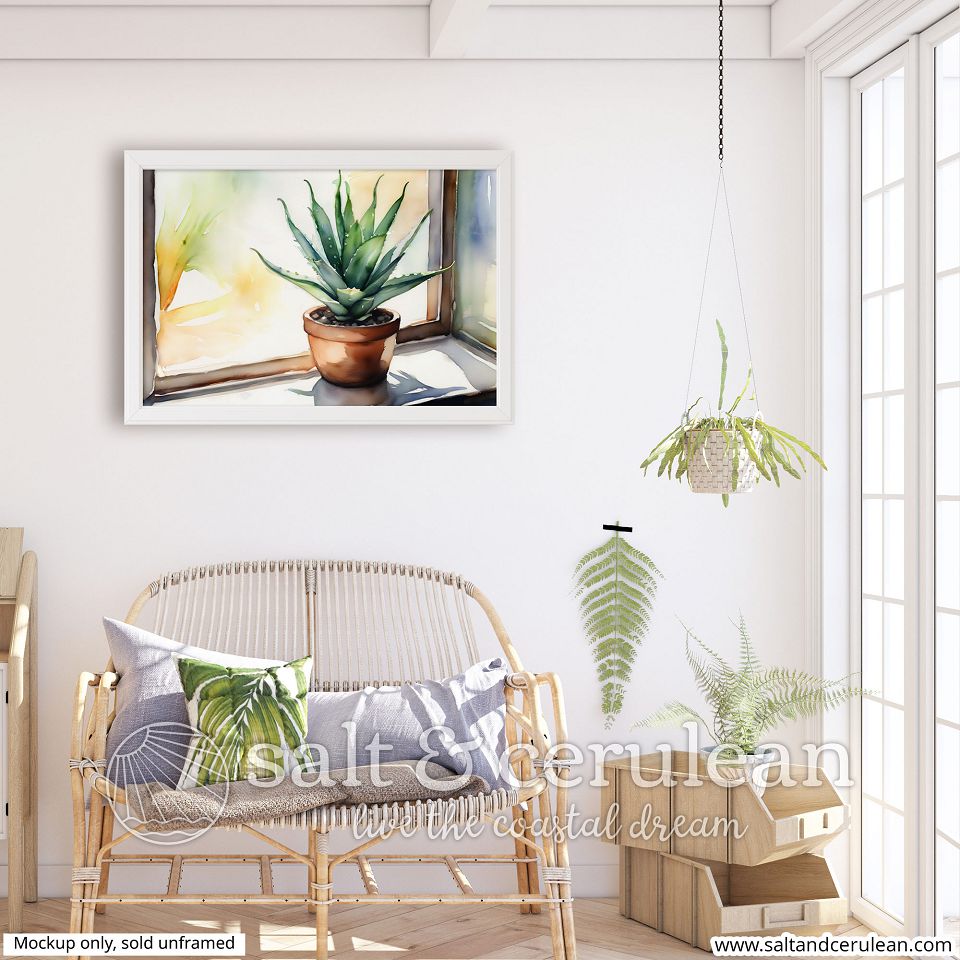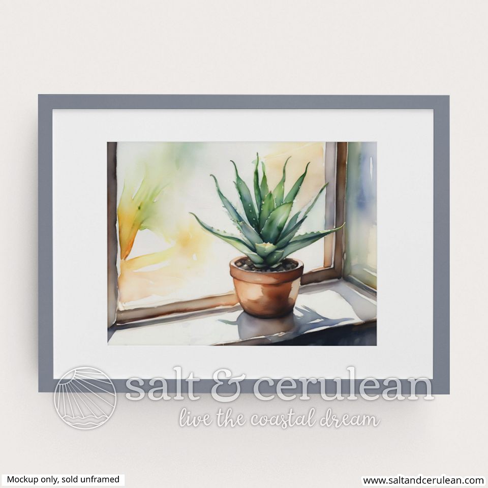 This is a print of a fun, simple watercolor painting of an Aloe plant on a sunny windowsill. Spring/Summer vibes abound.