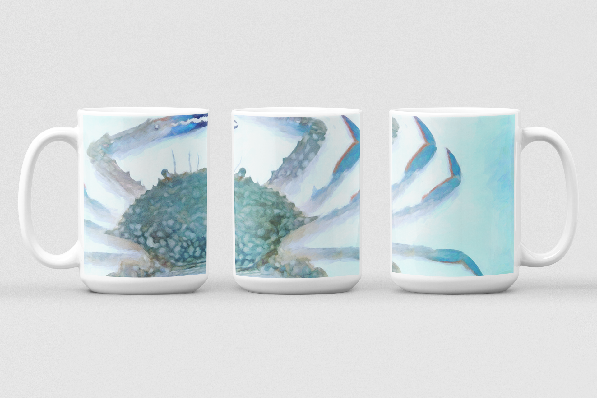 White ceramic mug with our Blue Crab artwork wrapped around. A small logo is in one lower corner
