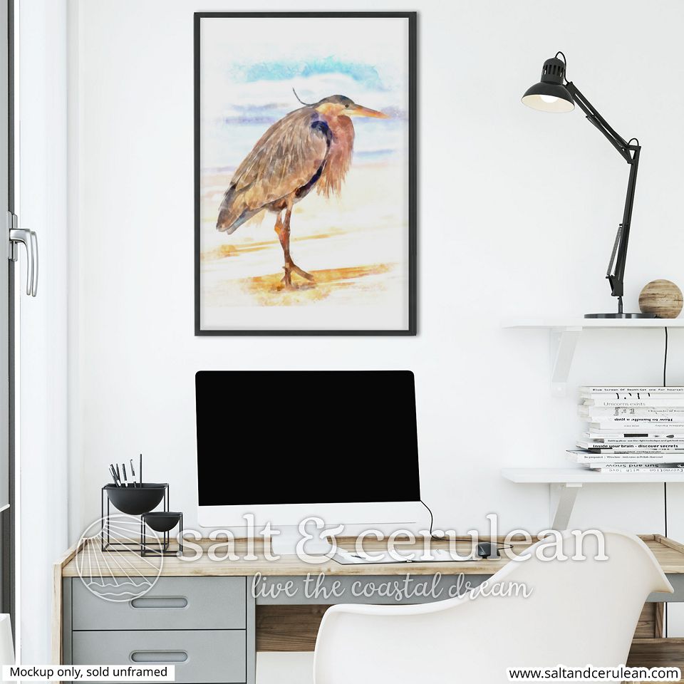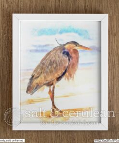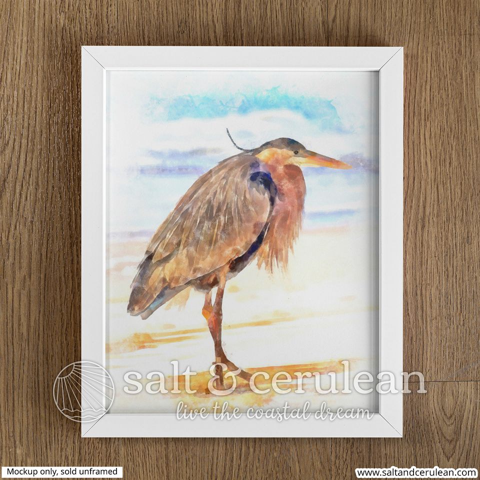 Brown Heron coastal wildlife painting. Museum-quality art prints made on thick and durable matte paper. Add a wonderful accent to your room and office with these prints that are sure to brighten any environment.