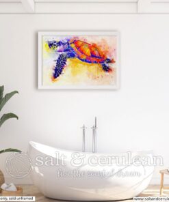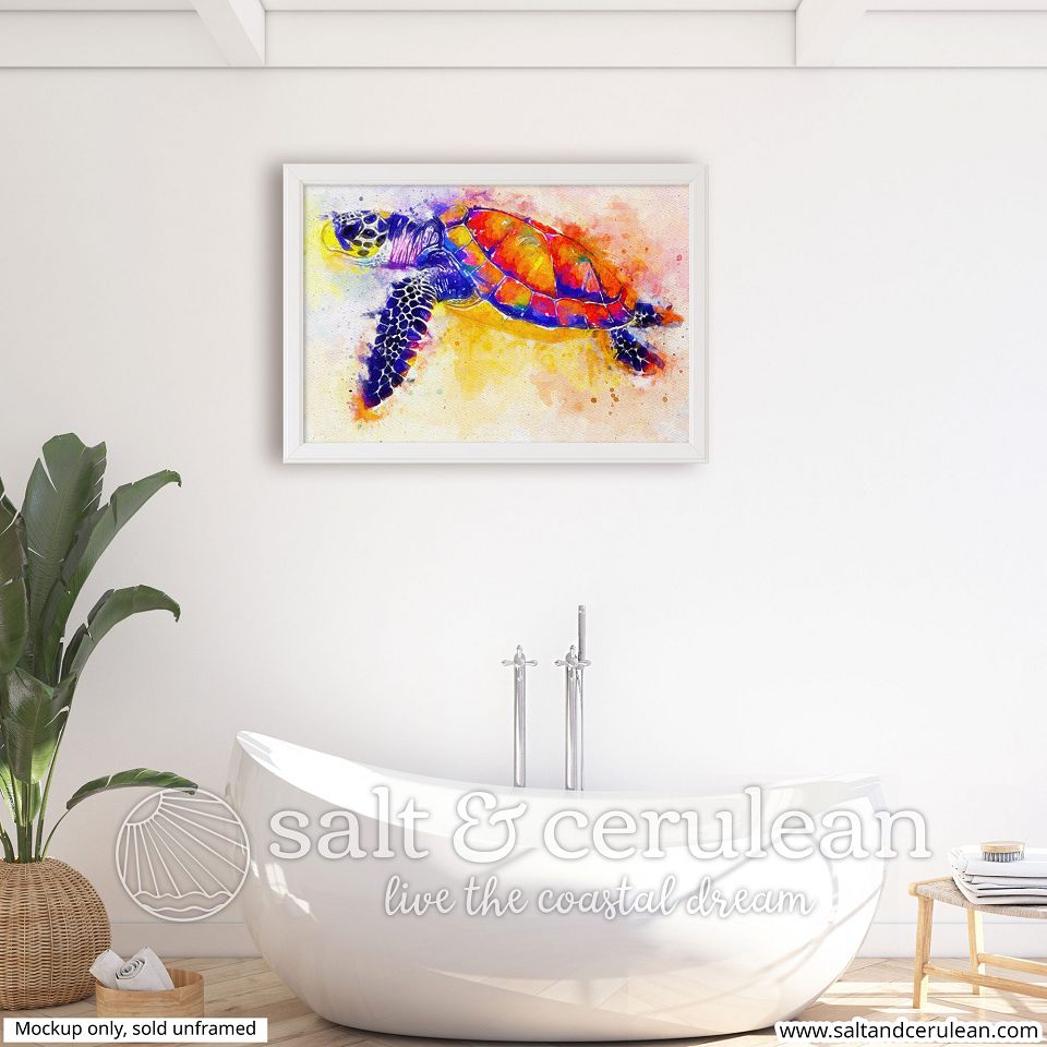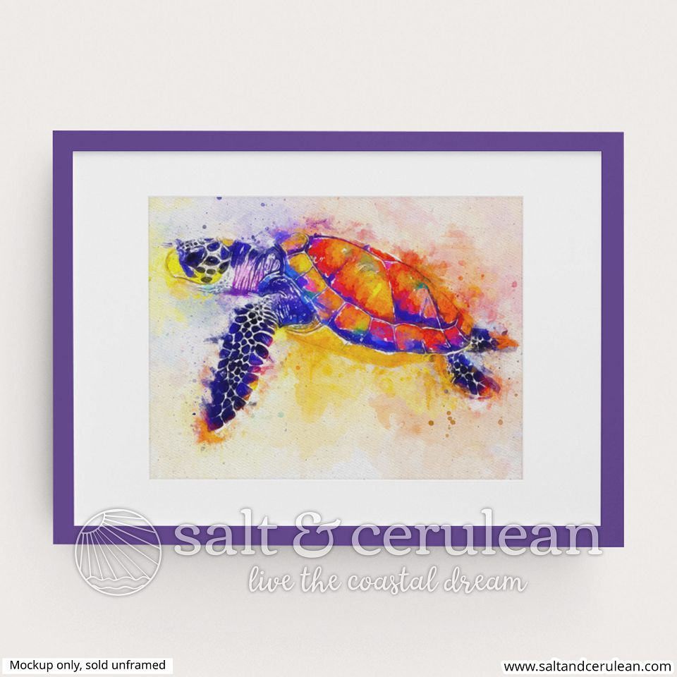 A colorful sea turtle watercolor. Features bright oranges and yellows, with deep complimentary blues and purples.