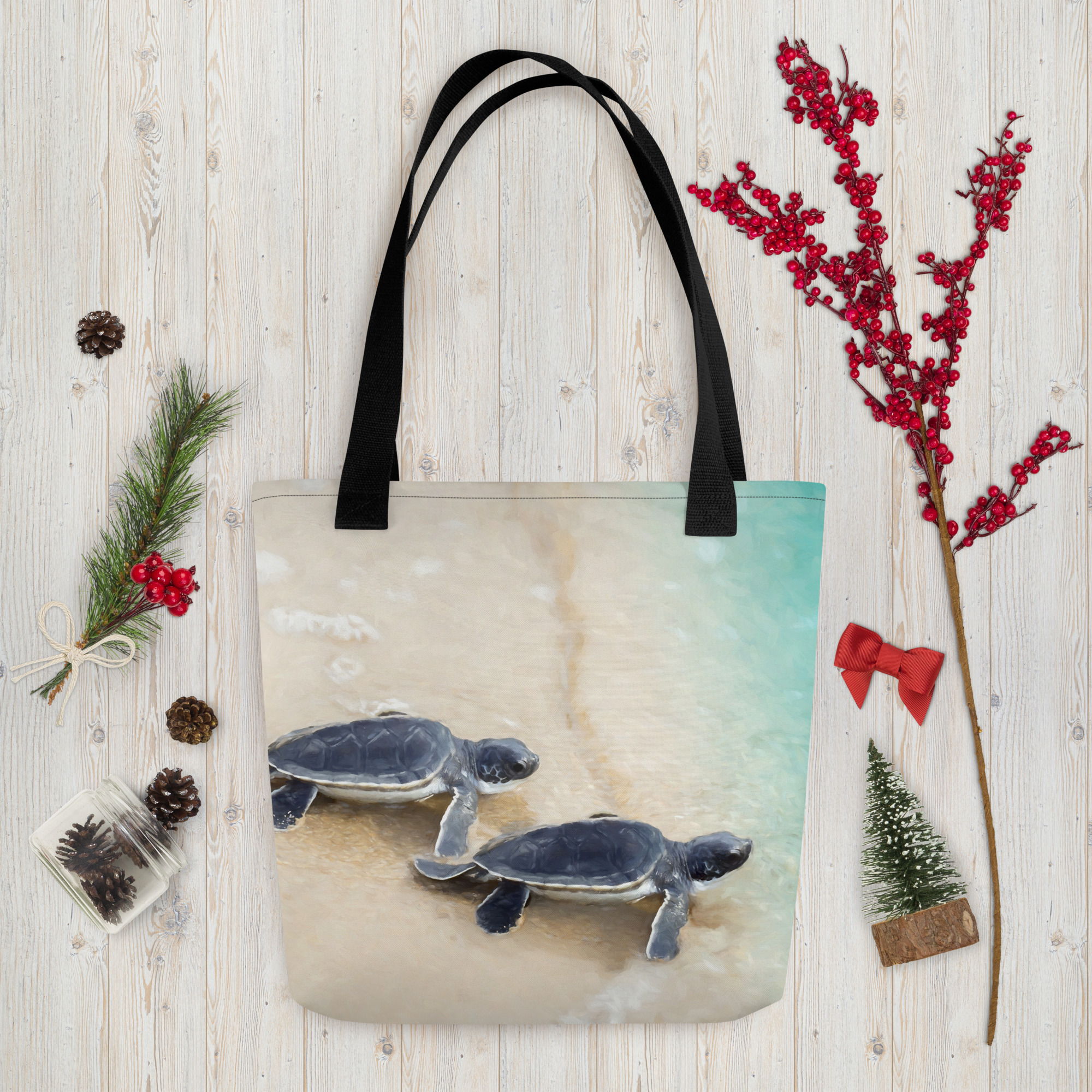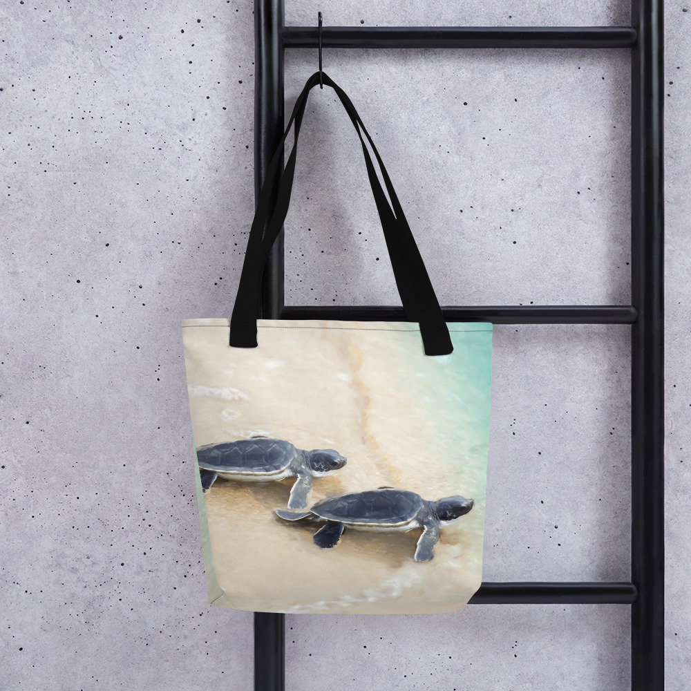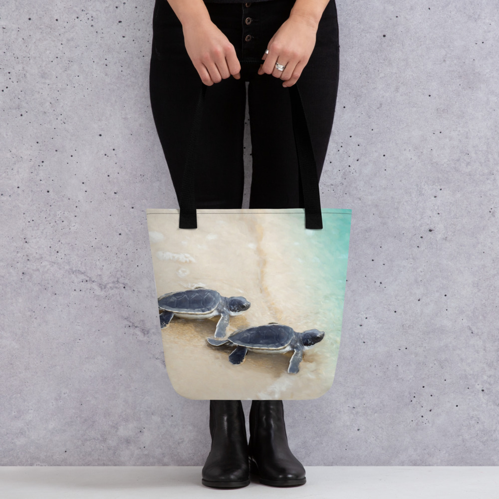 The Grand Adventure tote bag features my painting of baby sea turtles making it to the water from the nest. It’s spacious and trendy to help you carry around everything that matters.