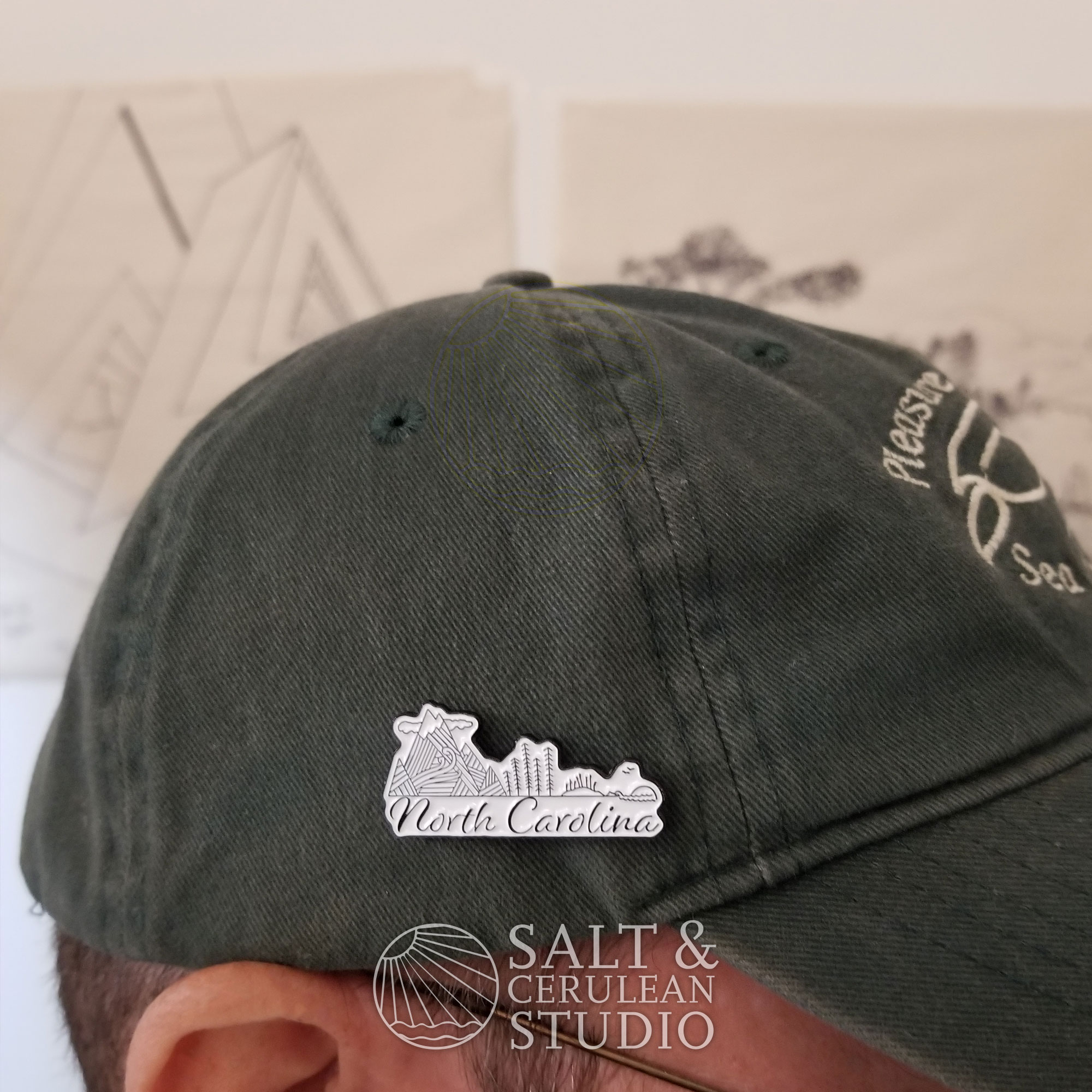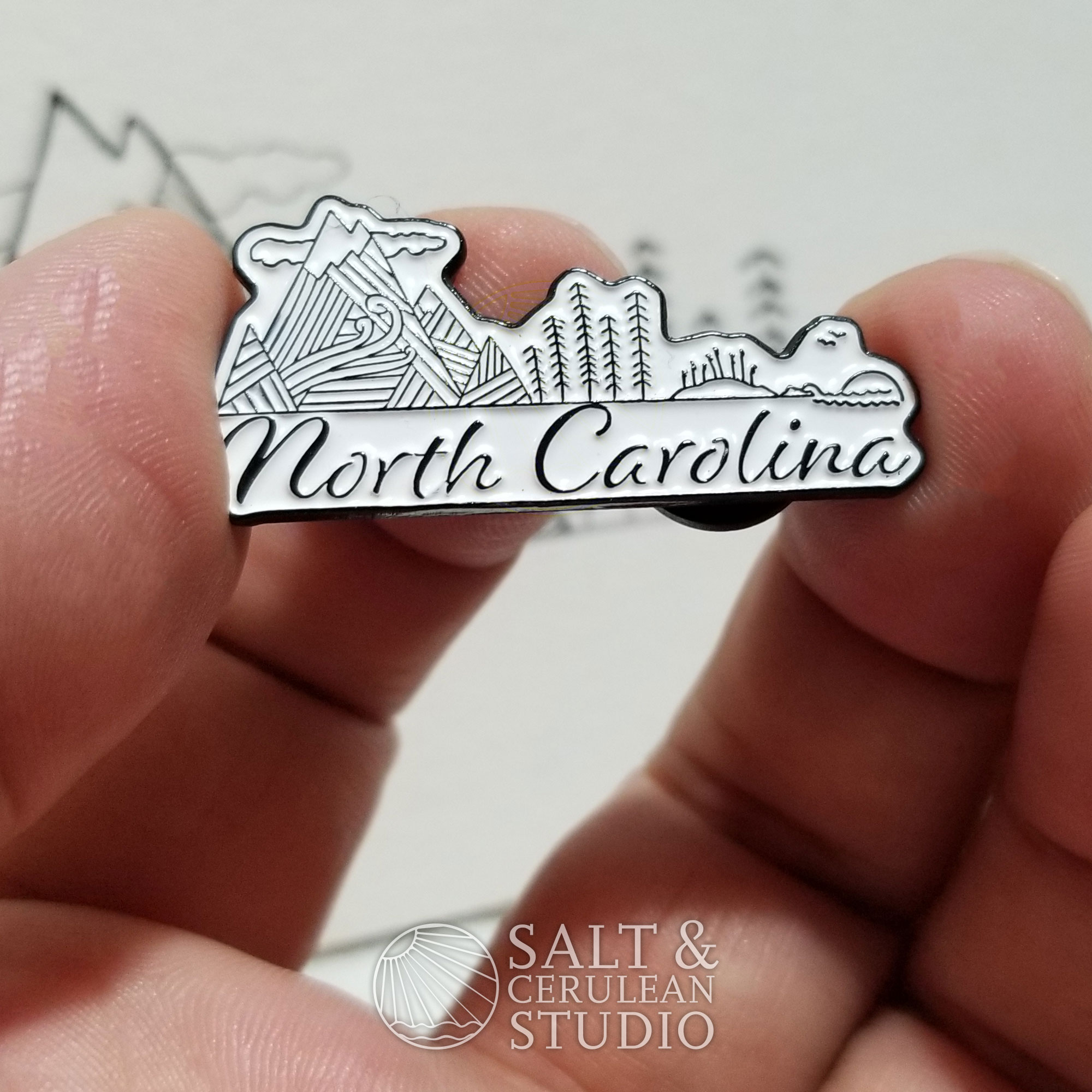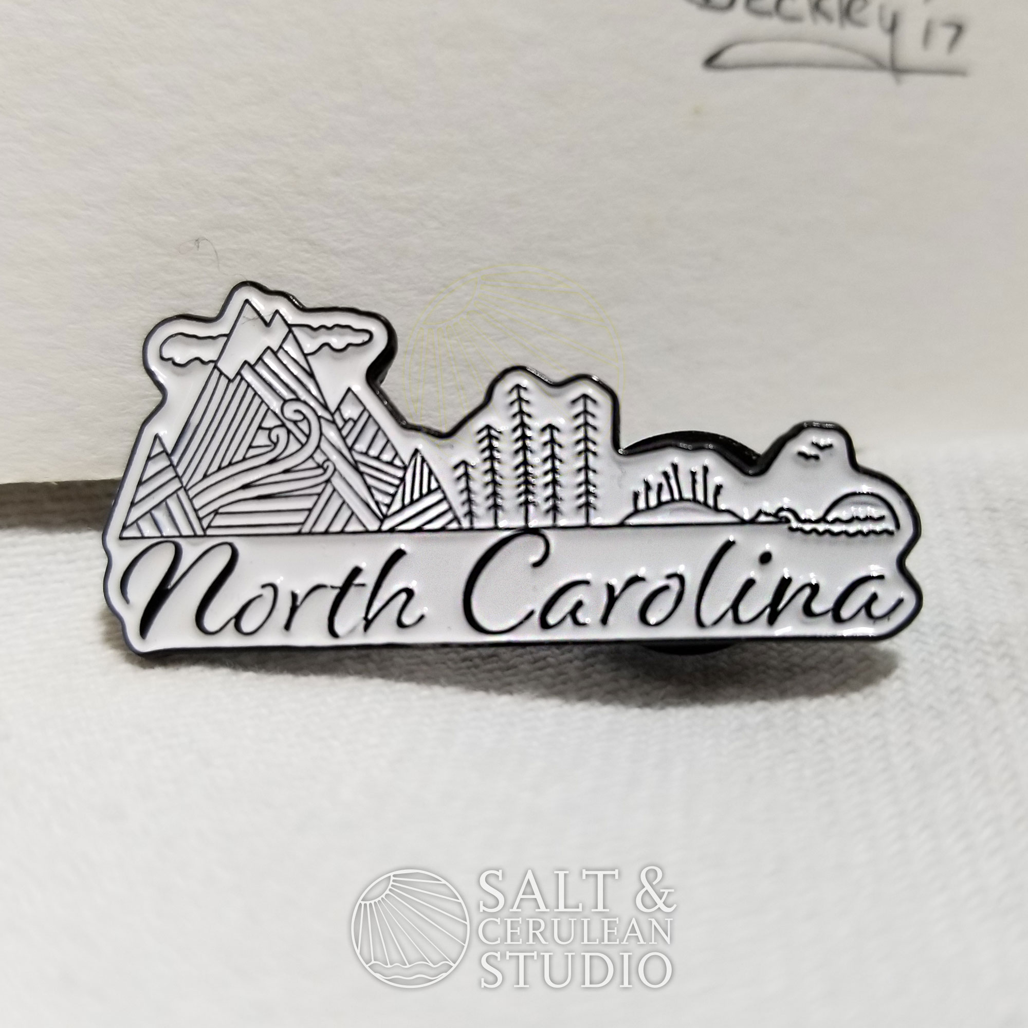 North Carolina enamel pin. Enamel pins are a fantastic, hip fashion accessory for hats, jackets, and messenger bags. Comes with two soft rubber backers that stay put.