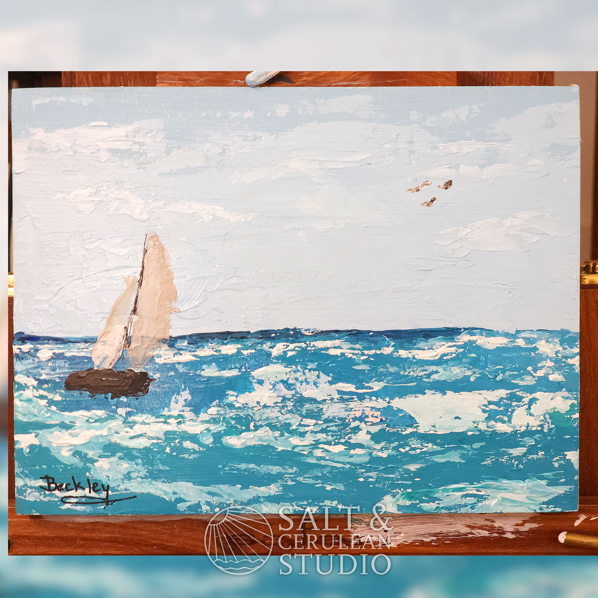©Peter Beckley, Sailing with Intent. Acrylics, 8×6 inches.