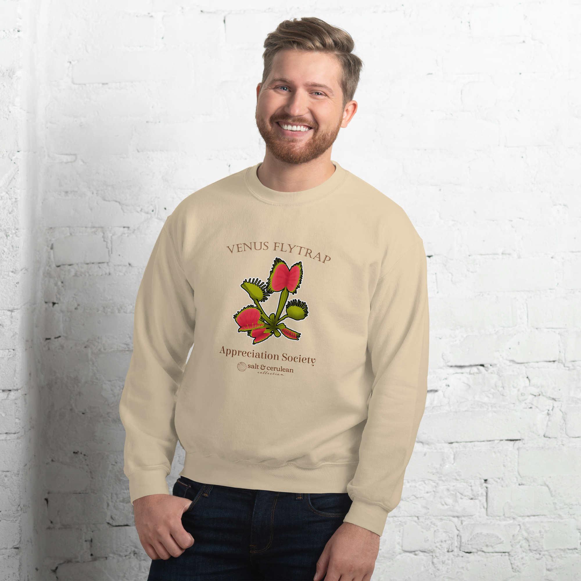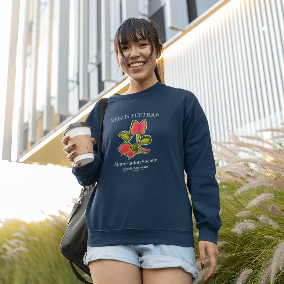 Long-sleeve sweatshirt with the phrase Venus Flytrap Appreciation Society. There is an illustrated venus flytrap plant. Design is on the front with the Salt & Cerulean Collection logo below and on the upper back. 50% cotton, 50% polyester. Unisex sizing.
