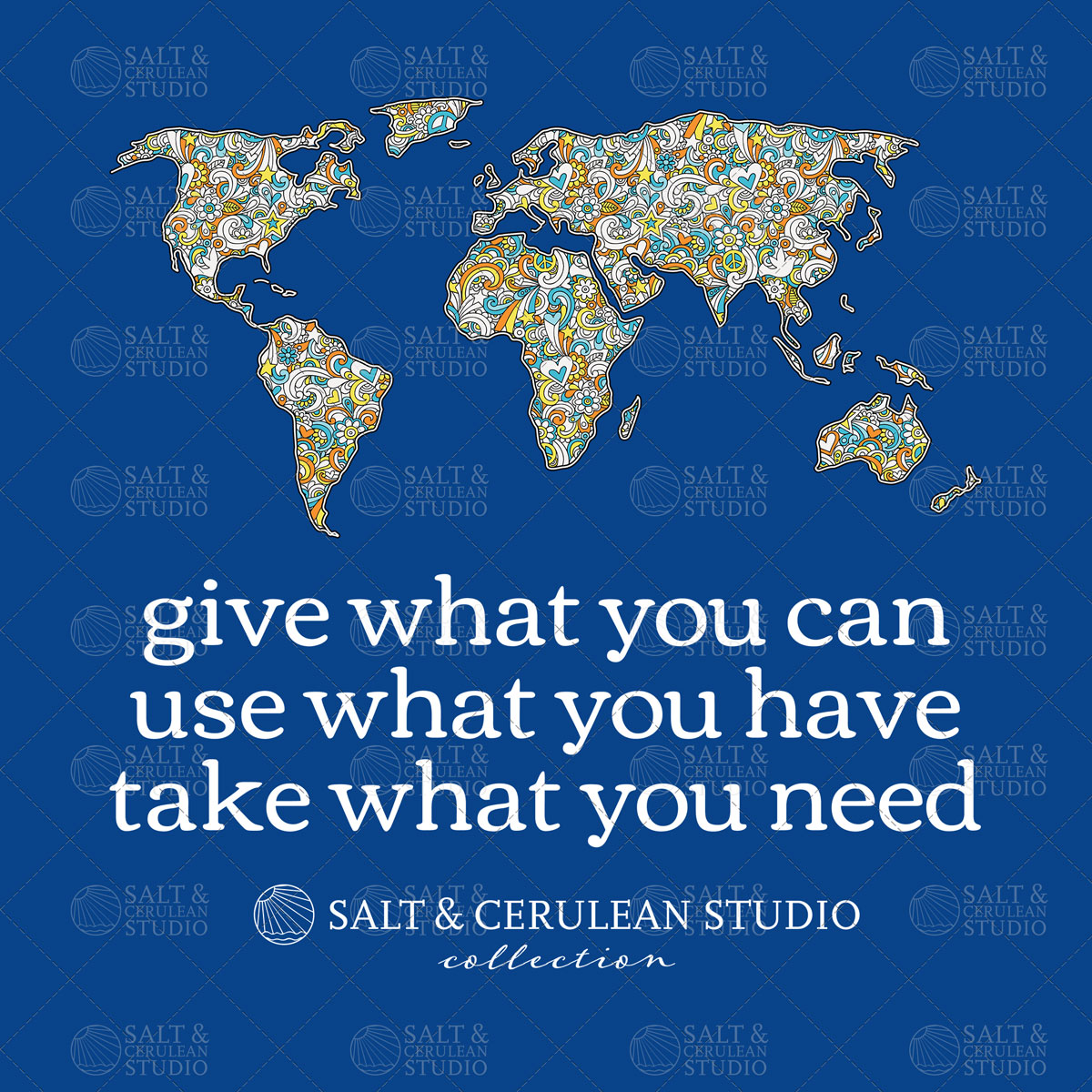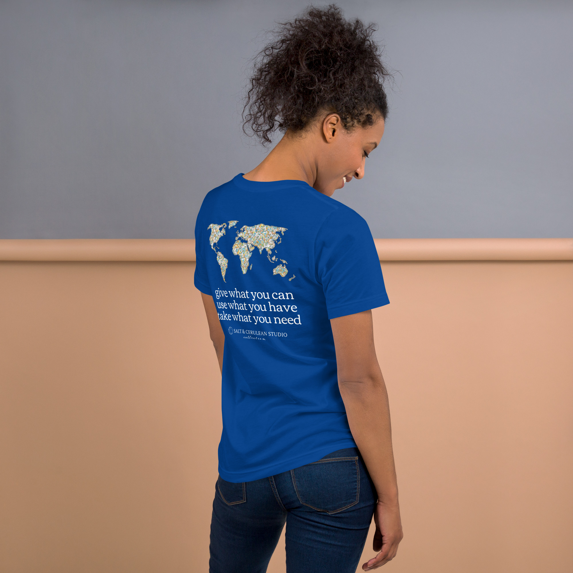 Royal short sleeve shirt with a map of the world filled with symbols of peace and love. Salt and Cerulean collection logo below and on the chest. 100% cotton. Unisex sizing. Everyone needs the perfect t-shirt to complement an everyday, laid-back look. The ideal top for so many occasions, this lightweight cotton tee will keep you comfy and looking smart.